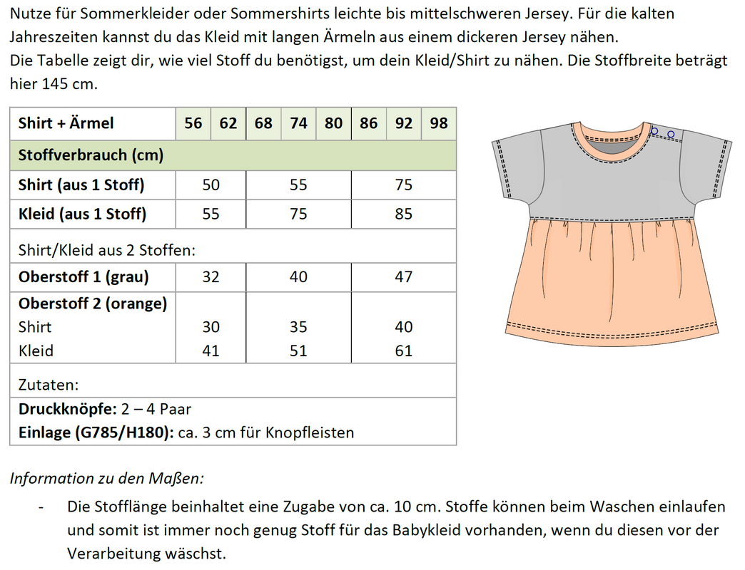 Das Schnittmuster enthält die Größen 56 bis 98 inklusive Nahtzugabe als A4 und A1 bzw. A0 PDF.