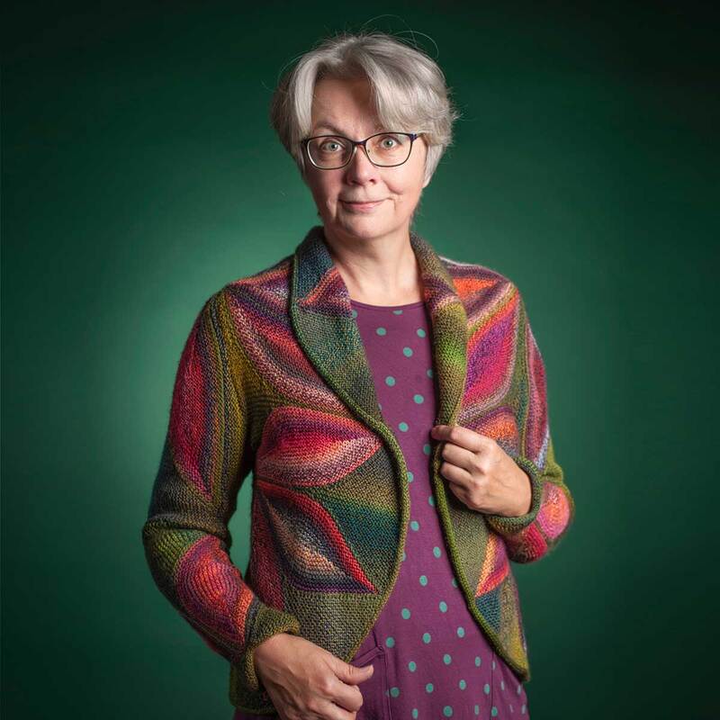 Die Jacke wird in einem Stück gestrickt, hinzu kommen die Ärmel und ein kleiner Einsatz im unteren Rücken. Begonnen wird mit einem offenen Anschlag. Das Muster aus Blättern und Keilen entsteht mit verkürzten Reihen.