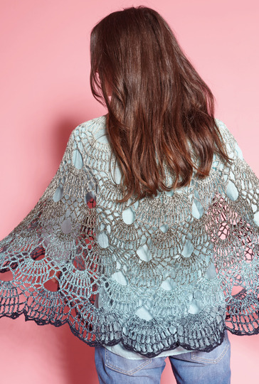 Aufsehenerregend ist dieser Poncho. Am Ausschnitt begonnen, wird er in immer größer werdenden Runden gehäkelt. Das Muster besteht aus Luftmaschen, festen Maschen, Stäbchen und überwiegend Doppelstäbchen. Für die Zunahmen werden an vier Stellen die Maschenmarkierer gesetzt. Sie werden am besten in jeder Runde mitgeführt. So weiß man immer genau, wo die Zunahmen gearbeitet werden. Ab der 14. Runde beginnt die Formgebung, damit der Poncho nicht zu weit wird. Es ist aber einfach, wenn du genau nach Anleitung und der zusätzlichen Häkelschrift arbeiten. Sollte dir der Poncho zu lang werden, kannst du ihn natürlich früher beenden. Wichtig ist nur, dass zum Schluss die 19. Runde als schöner Abschluss gehäkelt wird. Du benötigst eine Häkelnadel Nr 4. Das schöne Verlaufsgarn in Blau-Grau Tönen ist von Langendorf & Keller. Und der Poncho deckt die Größen 36, 38, 40, 42, 44 und 46 ab.