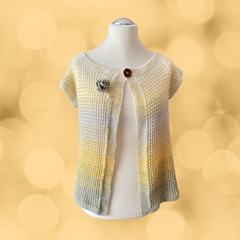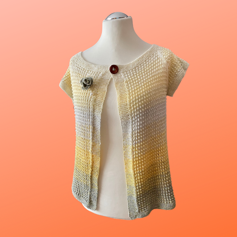 Der besondere Clou dieser Strickanleitung ist die bezaubernde Ansteckrose, die aus Restgarn mithilfe einer Gabel gefertigt wird. Ein kleines Detail, das der Weste den letzten Schliff verleiht.