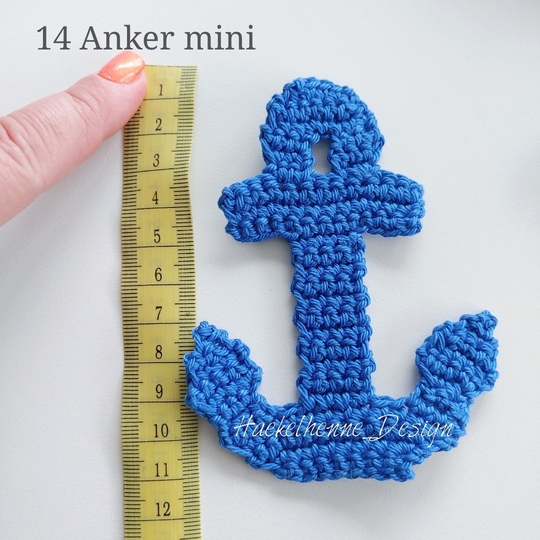 Die Anker Applikation erreicht mit einer NS von 2,5 mm eine Größe von ca. 11 cm. Dies variiert mit deinem Häkelstil, dem Garn und deiner NS.