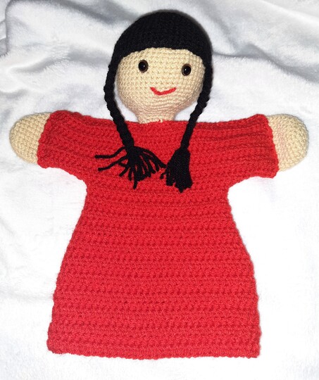 Hier präsentiere ich euch die Handpuppe Indianermädchen oder einfach nur ein Mädchen mit schwarzem Haar.
