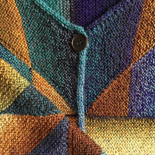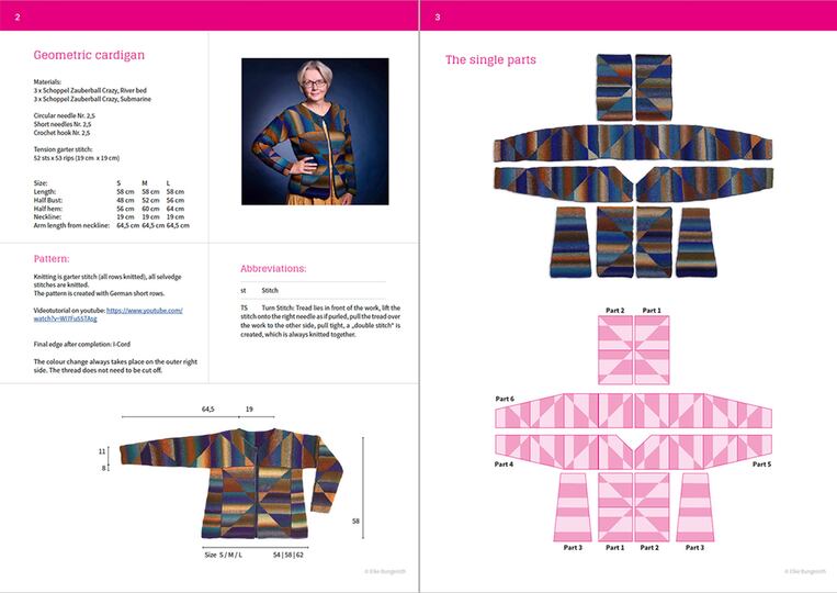 Die Jacke Geometric wird kraus rechts gestrickt, das Muster entsteht mit deutschen verkürzten Reihen.