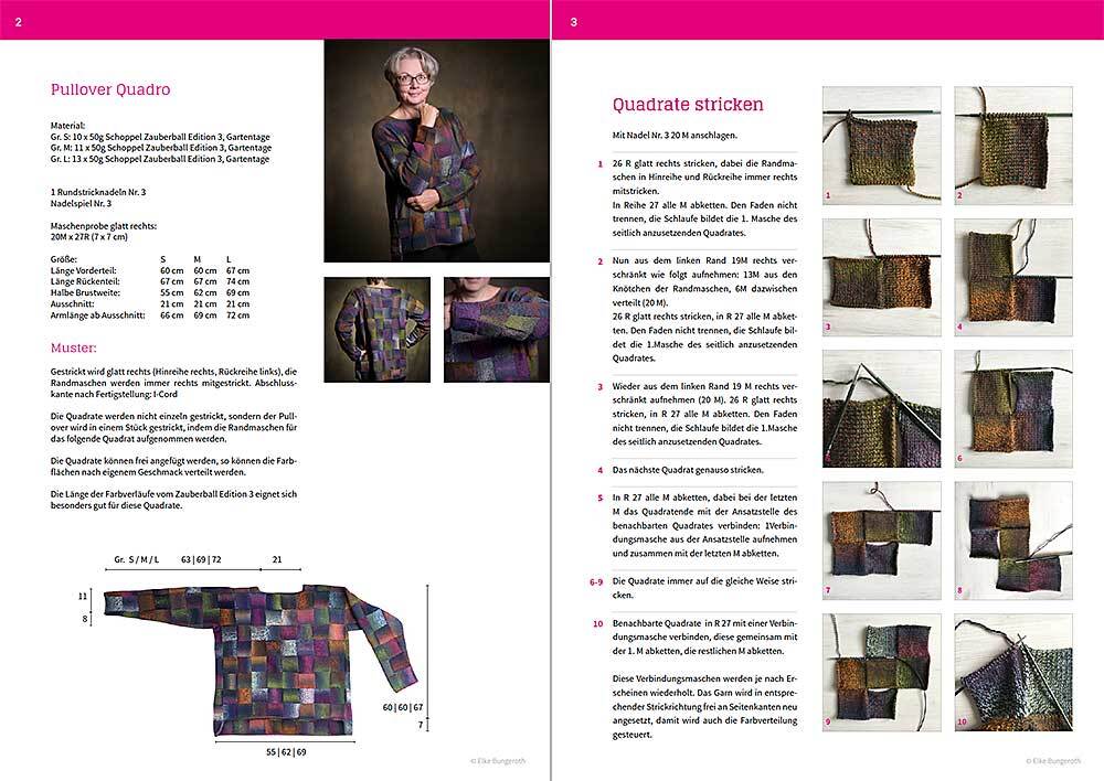 Der Pullover Quadro wird in einem Stück gestrickt und ist auch für Anfänger gut geeignet. Die Quadrate können frei angefügt werden, so können die Farbflächen nach eigenem Geschmack verteilt werden.So entstehen weniger Nähte zwischen den Quadraten.