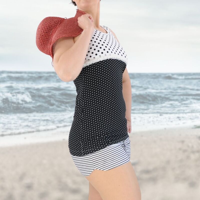 Freche kurze Hosen für den Strand oder als Schlafanzughose. Die Hose ist einfach zu nähen und wird am Bund mit einem Hosengummi und Kordel zum Binden gearbeitet.