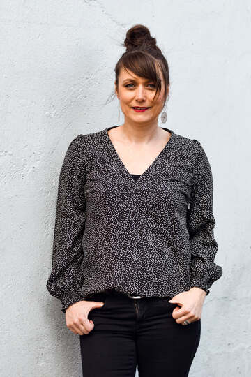 Unsere Bluse Sevilla ist eine digitale Nähanleitung mit Schnittmuster für ein Bluse in Wickeloptik für leichte Webware für Damen. Die Wickelbluse ist um den Bauch leger geschnitten und hat vier verschiedene Ärmelvarianten. Du hast die Wahl zwischen einem langen Ärmel, einem leichten Puffärmel in lang, einem kurzen Flügelärmel oder kannst die Bluse ganz ohne Ärmel nähen. Optional kannst du einen Schlitz in den Rücken nähen, der mit einem Knopf verschlossen wird.