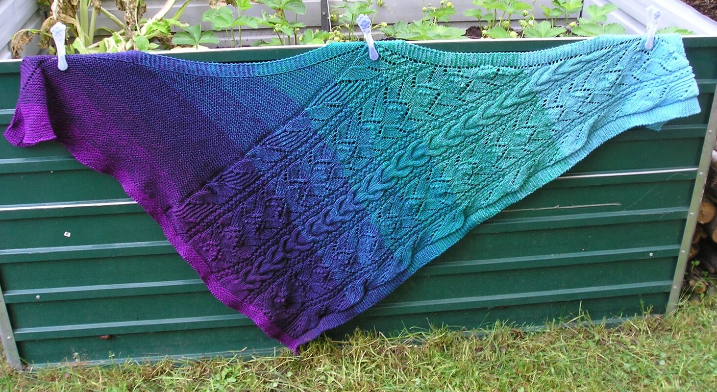 handgestricktes Dreieckstuch "Blauer Engel", mit einem Mix aus verschiedenen Loch- und Zopfmustern