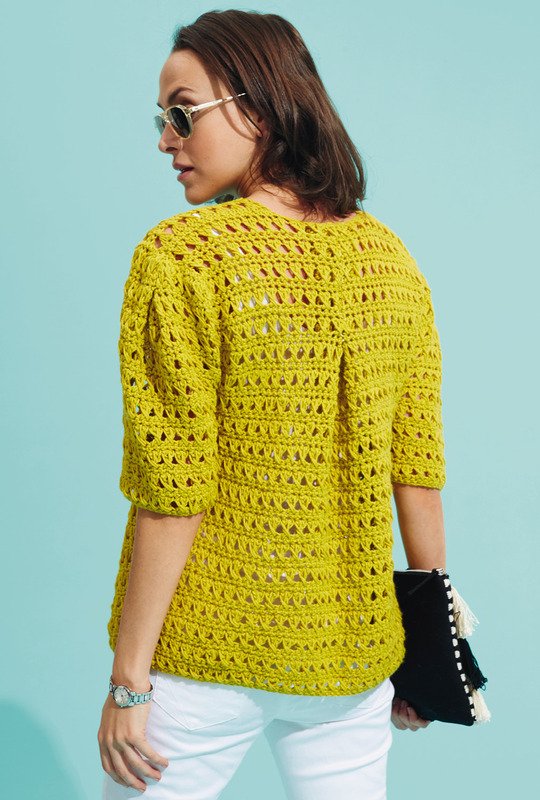 Welch ein Häkelpulli! Er geizt nicht mit Besonderheiten. Das Schlingenmuster ist alles andere als alltäglich. Allerdings ist es hier besonders wichtig, vorher eine Maschenprobe zu arbeiten. Es könnte sonst passieren, dass das Muster zu locker oder zu fest ist und die Maße am fertigen Pulli nicht stimmen. Ein besonderes Augenmerk hat auch die vordere Falte verdient. Sie verleiht eine feminine Note. Der Pulli ist so vielseitig, dass es auch perfekt über einem Shirt oder einer Bluse getragen werden kann. Die kurzen Ärmel haben das ganze Jahr über Saison. Bis zur Hüfte reichend ist er zu Röcken wie auch Hosen der ideale Begleiter. Das Garn, von Junghans Wollversand, wird mit Nadelstärke Nr 6 gehäkelt. Die Anleitung gibt es in den Größen 34, 36, 38, 40, 42 und 44.