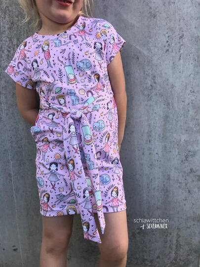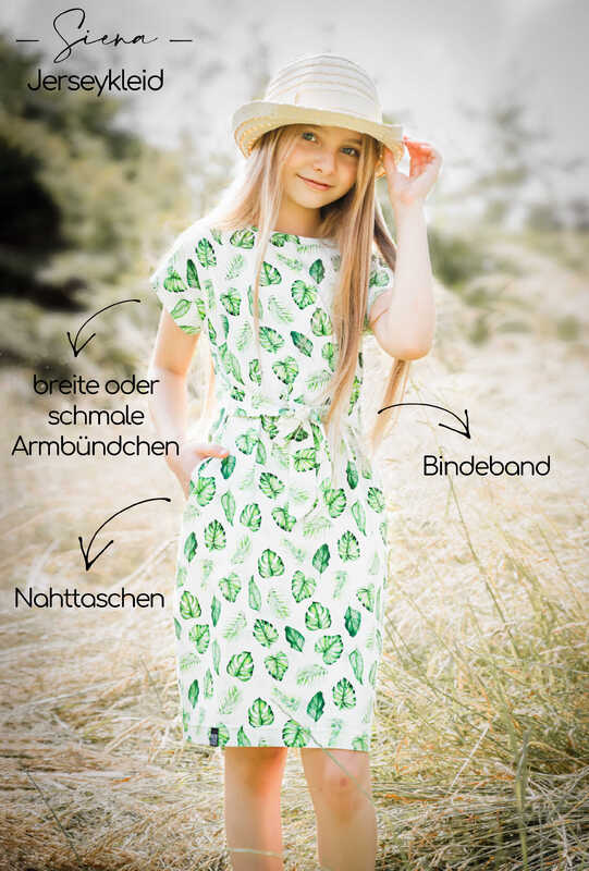 Unser Kleid Siena ist eine digitale Nähanleitung mit Schnittmuster für ein leichtes Kleid aus Jersey für Mädchen. Das Jerseykleid hat zwei verschiedene Saumlängen. Außerdem hast du die Wahl zwischen einem breiten und einem schmalen Armbündchen. Du kannst das Kleid wahlweise mit Nahttaschen nähen. Siena ist ein perfektes Sommerkleid für Anfänger und alle anderen. Bei Kindern mit kleinem Bauch empfehlen wir die Bänder hinten zu binden oder sie gänzlich wegzulassen, da der Bauch sonst betont werden würde. Das Kleid ist knielang geschnitten.