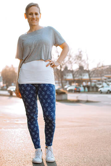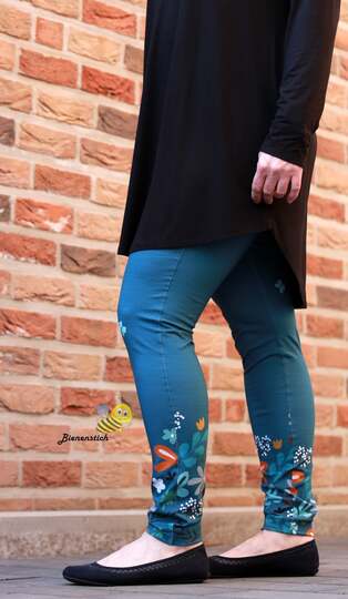 Dies ist ein einfaches Basic-Schnittmuster für eine Leggings (Alternativ auch 7/8-, 3/4 oder Radler-Hose). Bei diesem Schnitt hast du die Wahl zwischen einer einfachen Leggings aus einem Stoff oder einer Leggings mit ein oder zwei Teilungen auf Ober- und/oder Unterschenkel. Hier kannst du zum Beispiel mit Netzstoffen (Mesh) arbeiten und hast so eine schicke Sportleggings. Beim Bund hast du die Wahl zwischen vier verschiedenen Varianten, u. a. auch einer sehr bequemen High-Waist-Variante oder einem V-Bund.