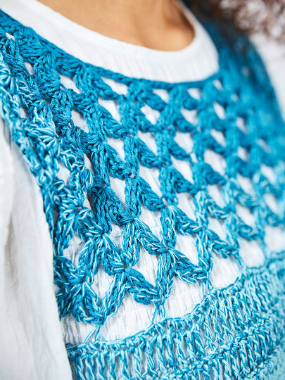 Das Top wird von oben nach unten gehäkelt und wir beginnen mit dem tiefen Blau und dem Wellenmuster für das Meer. Danach wechseln sich ruhiges Meer mit Sandbänken und Brandung ab. Das Top ist auch leicht Talliert und hat eine sehr gute Passform. In der Anleitung ist ein Häkelschema enthalten.