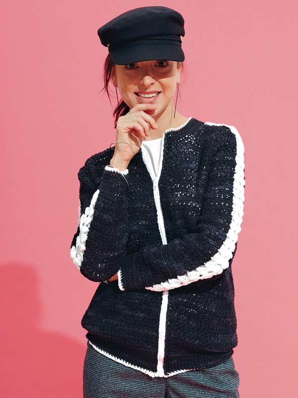 Für alle Fälle: Diese gehäkelte Reißverschluss-Jacke muss man einfach haben. Sportiv, wie aber auch elegant tragbar, fallen gleich die schönen, weißen Längsstreifen in den langen Ärmeln auf. Sie werden separat in einem Bordürenmuster über vier Maschen gearbeitet. Die linken und rechten Ärmelhälften werden nach den Bündchen getrennt gehäkelt. Dazwischen werden M übergangen. Die Streifen im Bordürenmuster werden dann zwischen die Ärmelhälften über die Schulter laufend genäht. Die Kanten glänzen in Weiß, sodass der Reißverschluss, darunter genäht, perfekt passt. Du häkelst mit Nadelstärke Nr 3 und einem Garn von Schoppel-Wolle. Die Anleitung gilt für die Größen 36, 38, 40 und 42.