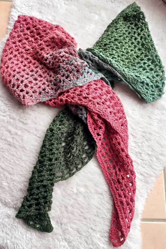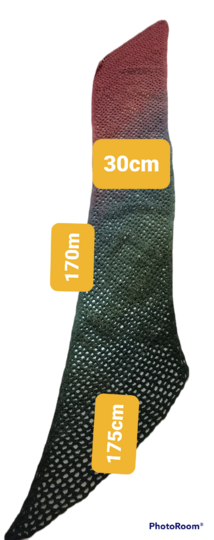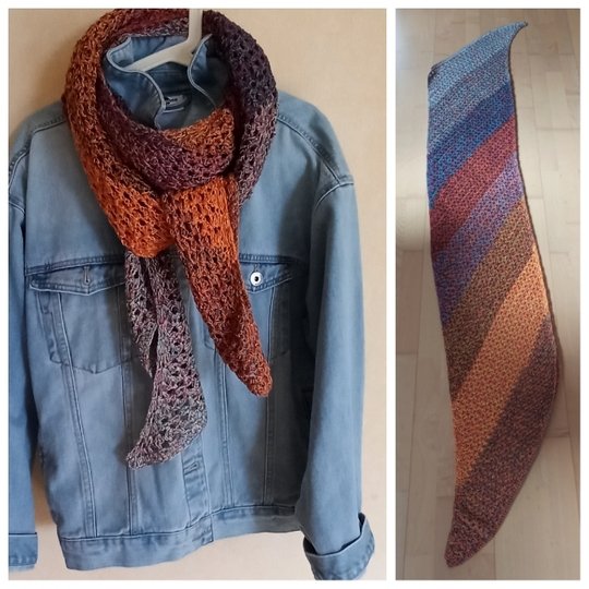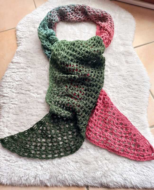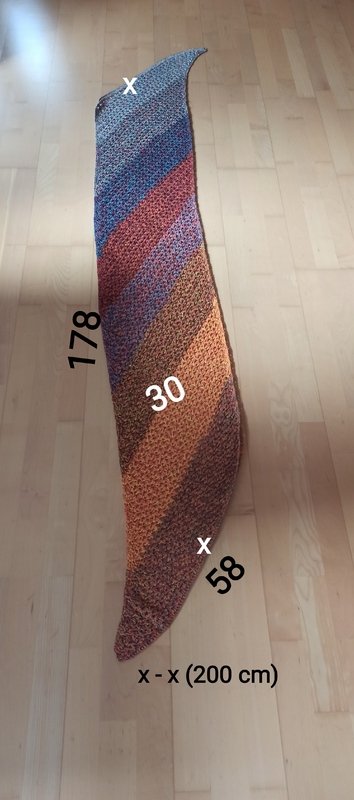 Der Schal auf dem Titelbild wurde mit einem 4 fädigen Farbverlaufsgarn mit einer Lauflänge von ca 800 m