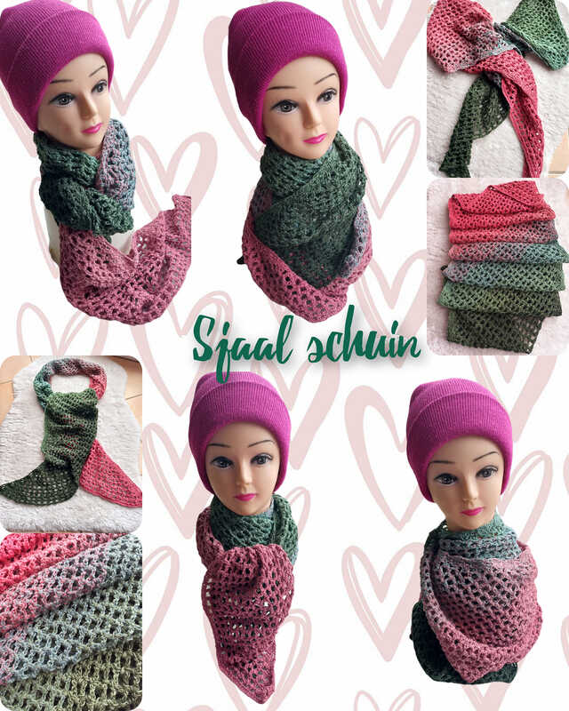 sjaal schuin ist niederländisch für °Schal schräg° und bezieht sich auf die Form des Schals. Er kann in jeder Breite und Länge nachgearbeitet werden, also auch als Stola. Mit seinem luftigen Muster eignet er sich auch für laue Sommerabende.