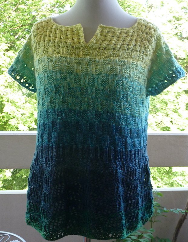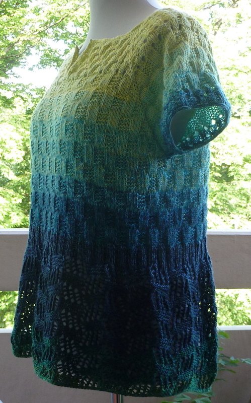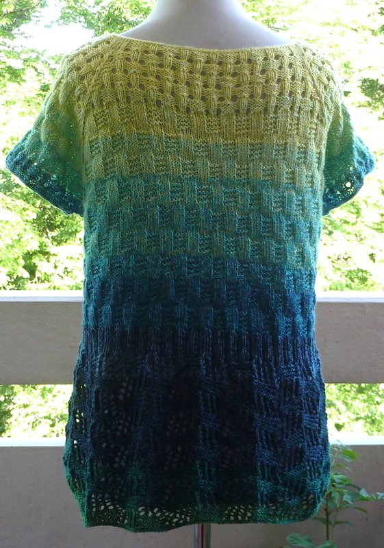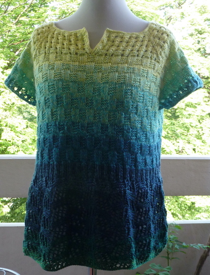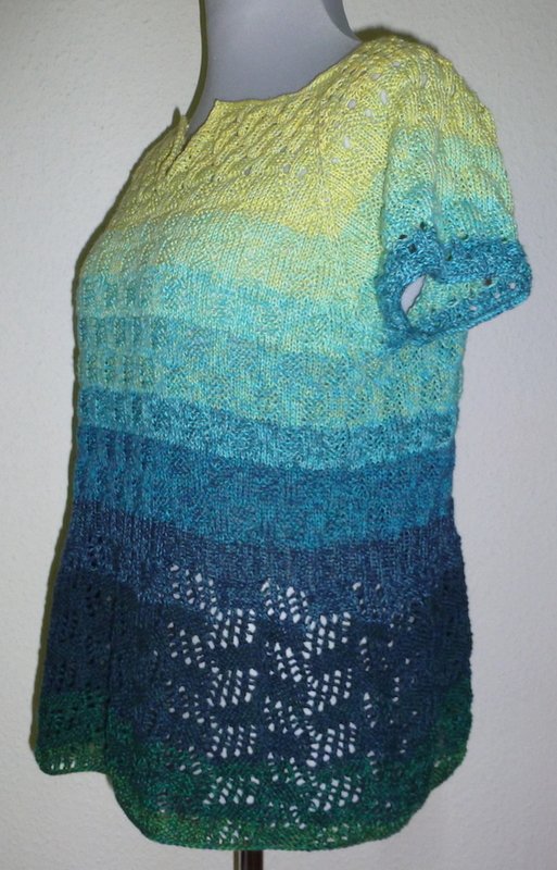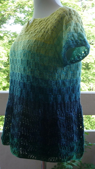 Von oben scheint die Sonne zu leuchten und webt sich in verschiedenen Flechtmustern bis nach unten zum Saum. Gestrickt wird diese Tunika von oben nach unten aus einem Farbverlaufsbobbel, anfangs in Reihen, dann in Runden.