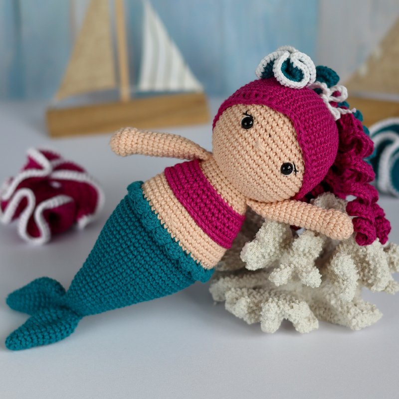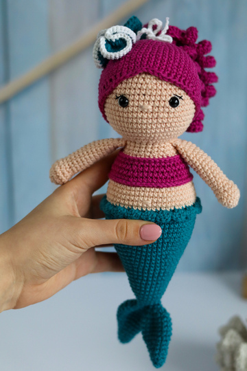 Dies ist eine digitale, deutschsprachige Häkelanleitung (PDF) für die Meerjungfrau Merle.