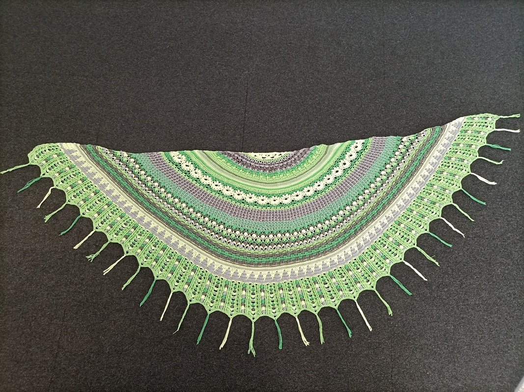 Tuch Mali ist ein außergewöhnliches halbrundes Tuch, das wegen der verschiedenen Häkeltechniken sehr abwechslungsreich ist und beim Häkeln nie langweilig wird.