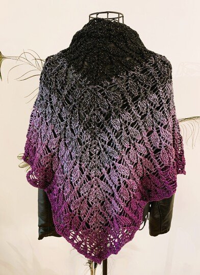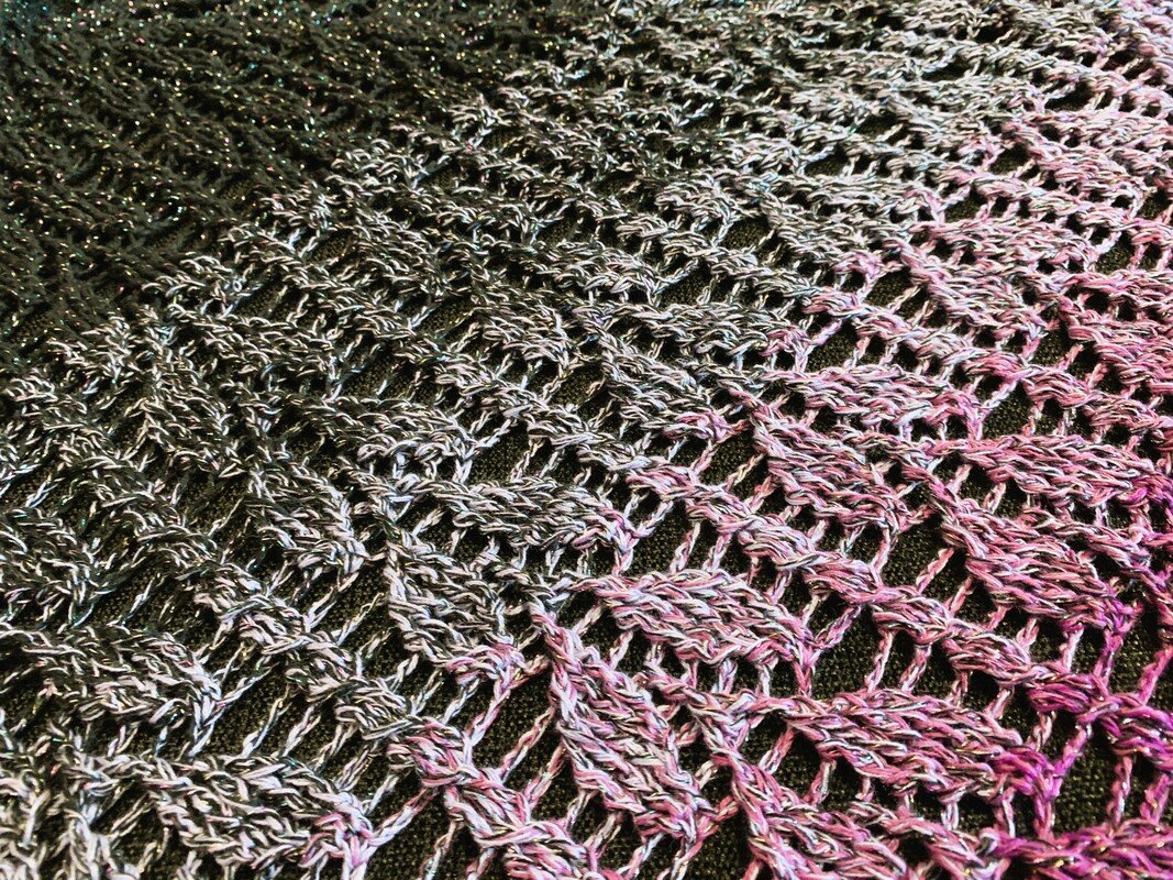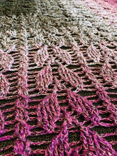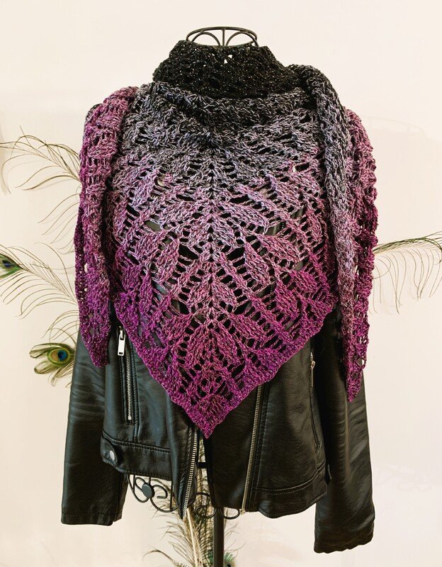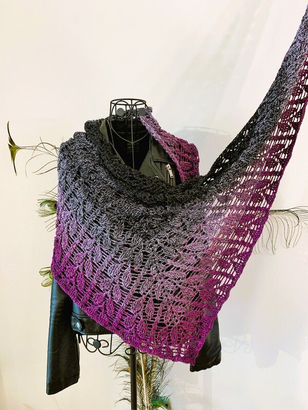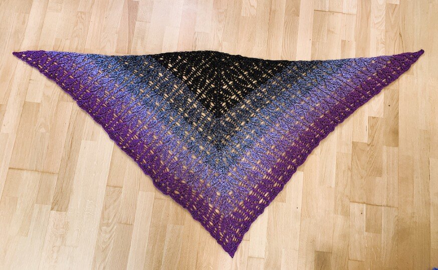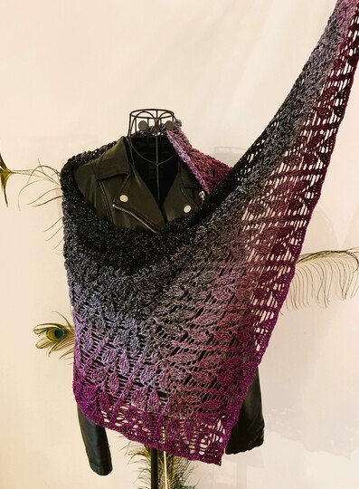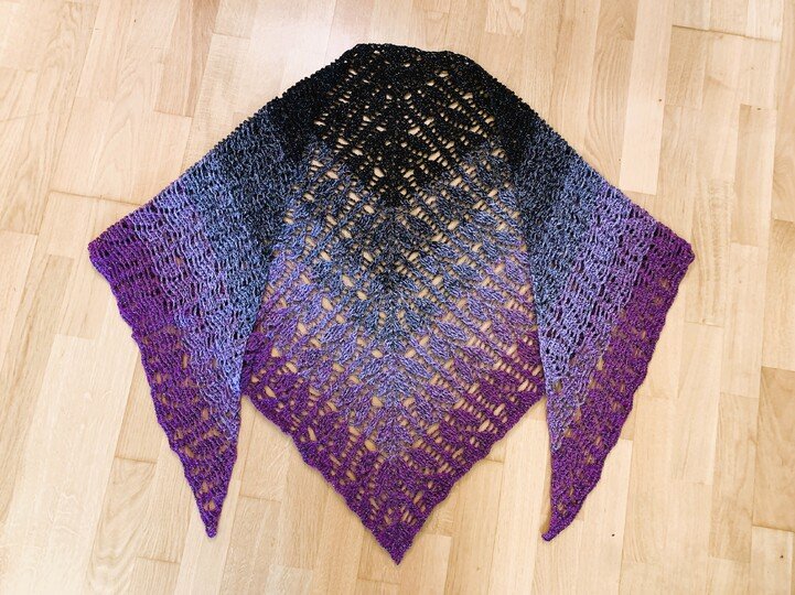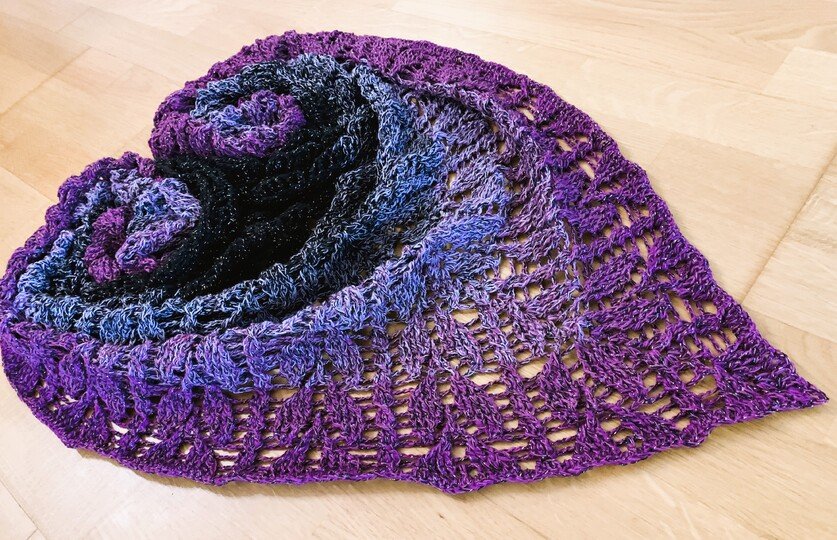 Folgende Wolle wurde verwendet: Lilu's Märchengarne, 4-fädiger Bobbel (43% Polyacryl, 43% Baumwolle, 9% Polyester, 5% Polyamid), 1140 m Länge, 300 g, Farbe: Mystery Purple - der gesamte Bobbel wurde für das Tuch verhäkelt.