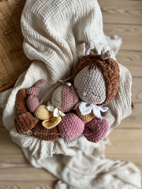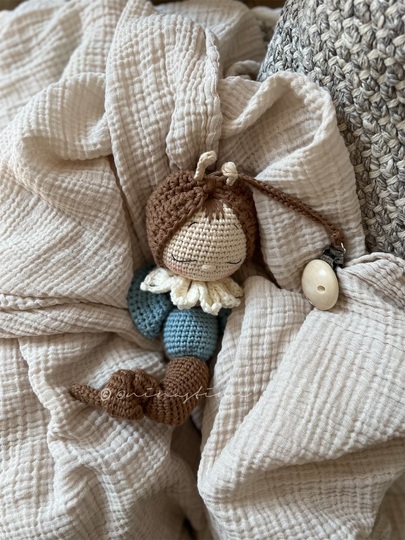 DIes ist eine Häkelanleitung der kleinen Raupe Mimi mit kleinen Flügeln und Mütze.