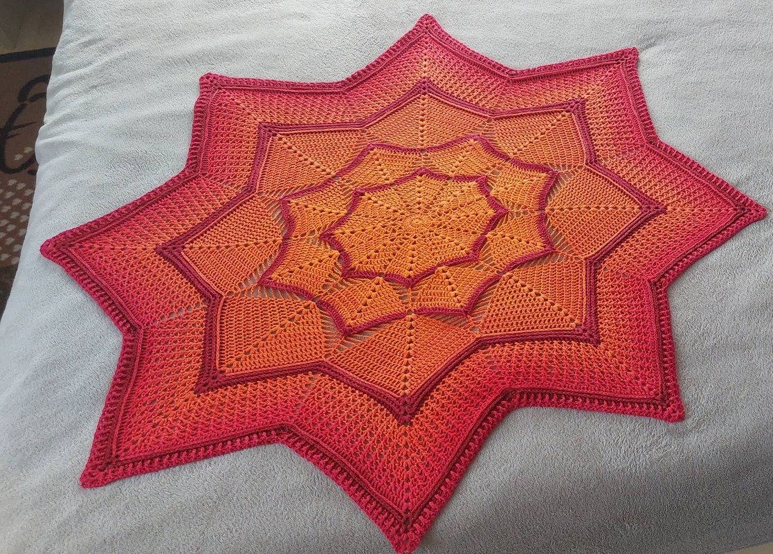 Der Durchmesser schwankt, je nachdem wie fest oder locker gehäkelt wird, zwischen 80 und 90 cm.