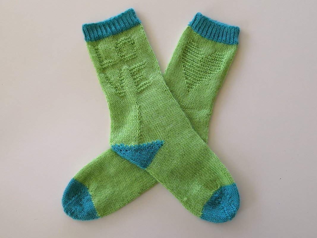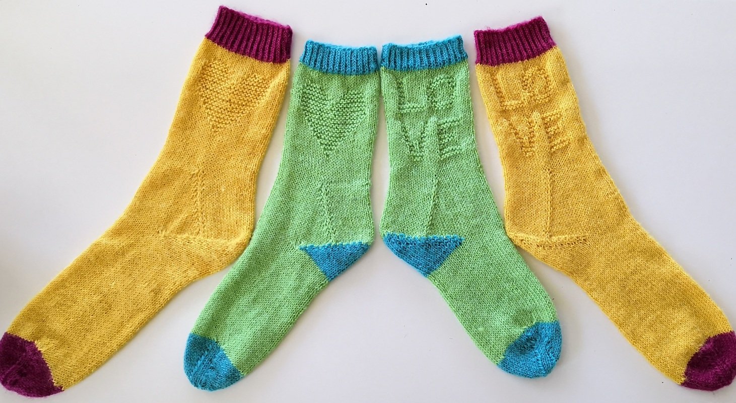 Diese Socken machen gute Laune beim Stricken und verbreiten sogar noch eine Botschaft. Damit kannst Du jemandem zum Geburtstag, zu Weihnachten, zum Mutter- / Vatertag oder einfach zwischendurch sagen, dass Du ihn / sie gern hast. Natürlich kannst Du die Socken auch für Dich selbst stricken und ein Zeichen für die Liebe setzen 😊