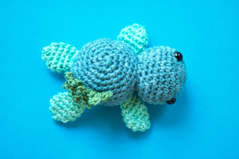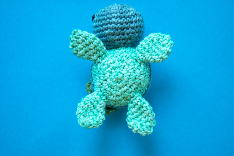 Das einzige was angenäht wird sind der Kopf und die Alge, alles andere wird in einem Stück gehäkelt.
