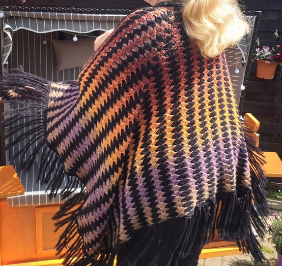 Der Poncho des Titelbilds hat ebenfalls 3 Abschnitte, er wurde mit NS 3,5 gearbeitet, weshalb der Verbrauch etwas höher war. Es wurden 1200 m in schwarz und 1500 m in bunt (incl. Fransen), ebenfalls 4-fädig, verarbeitet, das ergab eine ähnliche Größe.