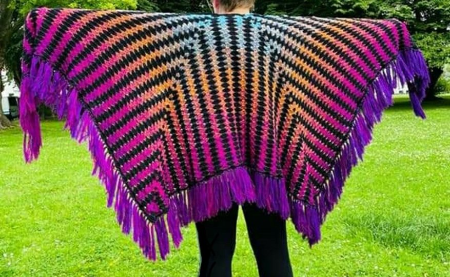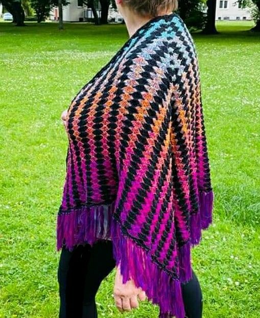 Das Colours IV ist ein Poncho, also Mehrecktuch, wobei Du selbst wählen kannst, wie viele Abschnitte Dein Poncho haben soll, also wie groß und weit er werden soll.