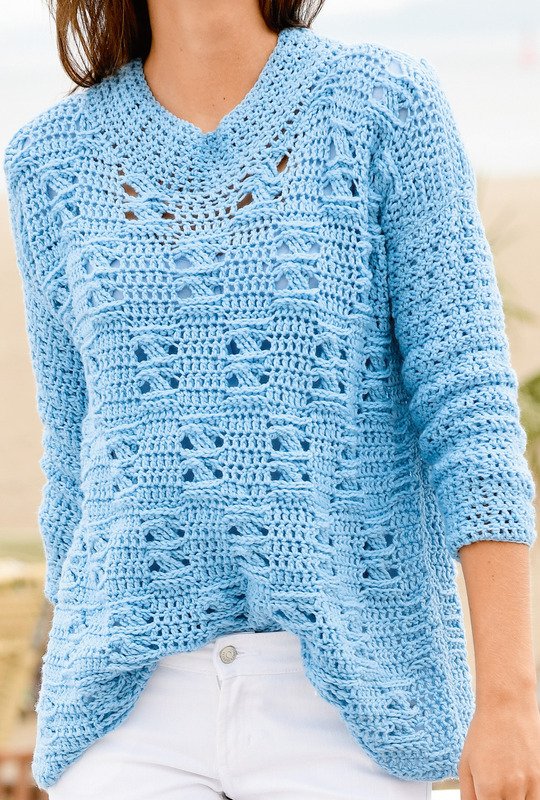 Ein Pulli, perfekt für die Übergangszeit. Das leichte Schurwoll- Mischgarn wird luftig verhäkelt. So hat das Maschenbild eine leichte Tranzparenz und der Pulli ist nicht so warm. Zudem fällt er ganz weich und die Weite umspielt lässig den Körper. Die Zopfmotive bei Vorderteil und dem Rückenteil entstehen durch dreifache Reliefstäbchen. Diese werden auf der Vorderseite der Arbeit über Kreuz gearbeitet und immer um den Kopf der darunterliegenden Maschen gehäkelt. Das restliche Muster besteht aus Stäbchen. Die Ärmel werden im Rippenmuster gehäkelt. Hier wechseln sich doppelte Reliefstäbchen mit einfachen Stäbchen ab. Auch die breite Halsblende ist in dem schönen Rippenmuster gearbeitet. Du häkelst mit Nadeln Nr 3,5 und 4,5 und mit Garn von ONline. Die Anleitung beinhaltet die Größen 36, 38, 40, 42, 44 und 46.