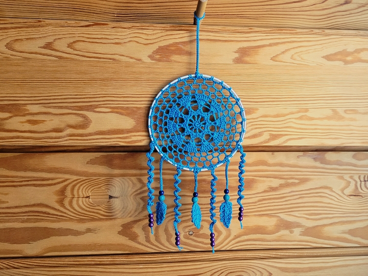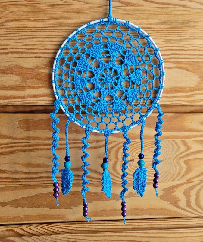 Der Traumfänger Blue Bayou ist einfarbig und das Blau des Garns hat mich zu diesem Namen inspiriert.
