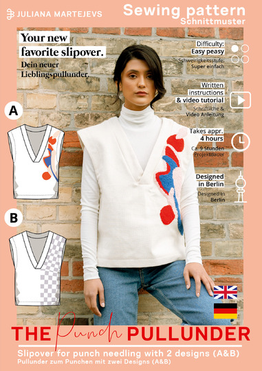 Das Schnittmuster und die Anleitung als Ebook für deinen neuen Lieblingspullunder "The Punch Pullunder". Mit zwei verschiedenen Längen und Mustern und kostenloser Video-Anleitung auf unserem YouTube-Kanal JULIANA MARTEJEVS - Das DIY-Modelabel oder unserer Website (s. Profil).