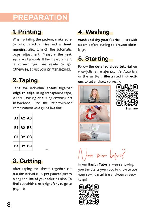 Wenn du dein Schnittmuster heruntergeladen, zusammengeklebt und die Materialien beisammen hast, freue dich auf den spaßigen Produktions-Prozess, der jetzt folgt! Falls du noch nie genäht hast, schau dir als erstes unser Nähmaschinen Grundlagen Video-Tutorial auf unserem YouTube-Kanal an. In wenigen Minuten erfährst du alle Basics, die du für jedes JULIANA MARTEJEVS Nähprojekt benötigst. Dann klick einfach auf die zu deinem Projekt passende Video-Anleitung und los geht’s!