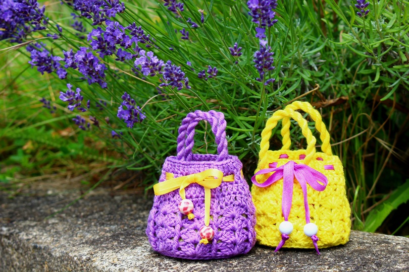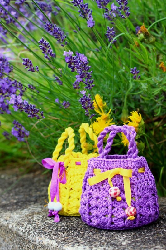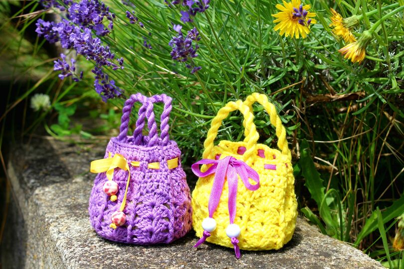 ca 20 gr Schachenmayr Catania 125m/50g, Häkelnadel 2,5 mm, Satinband