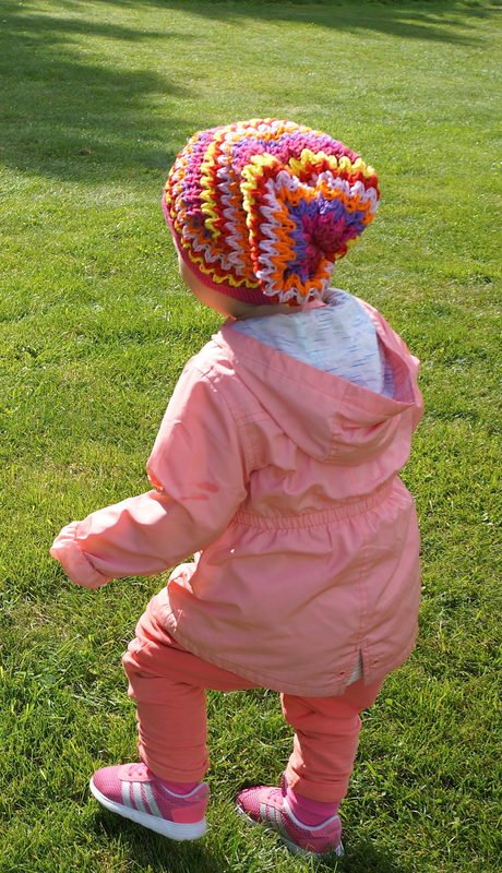 Die Anleitung beschreibt die Mütze als kurze (s. Bild blaue Mütze) oder lange (s. Bild rosa-gelb,lila-Mütze) Beanie für KU 45-59.