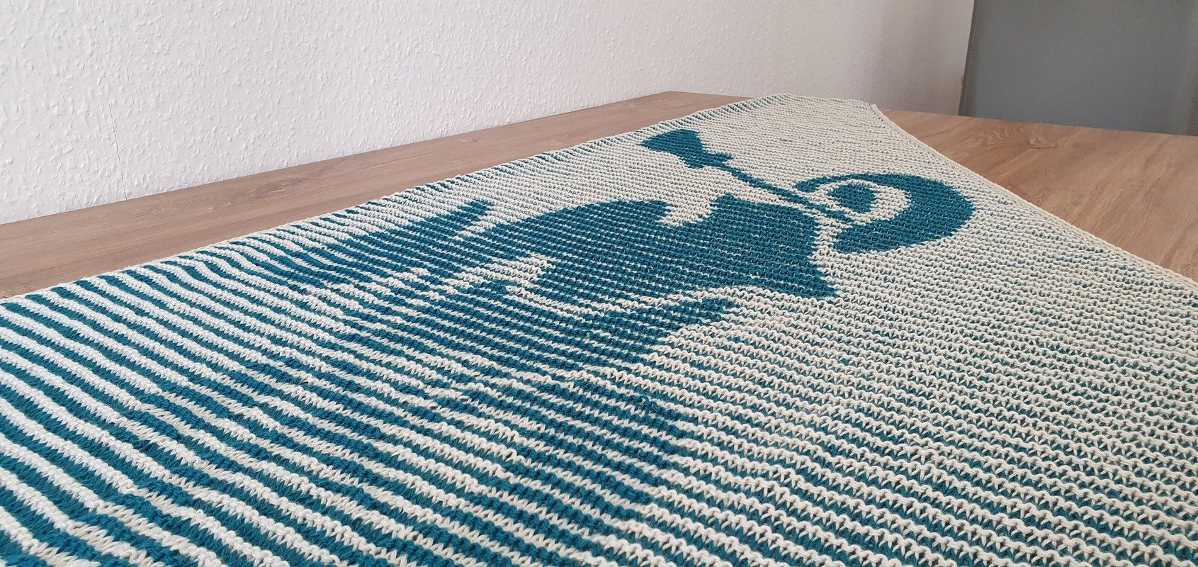 Die nächste Anfrage aus meiner Gruppe. Ein ehemaliges Logo wird zu einem Schattenstrick Tuch. Um daraus dann einen Seelenwärmer zaubern zu können. Ich bin sehr dankbar, dass mir dieses Motiv zur Verfügung gestellt wurde, denn es kommt so gut raus. Danke dafür.