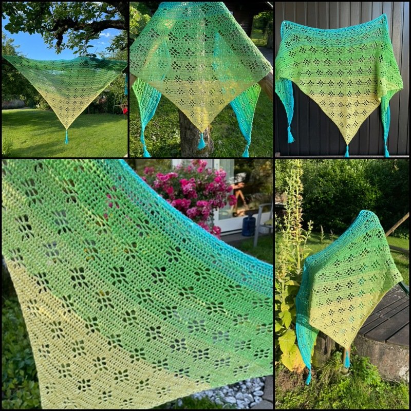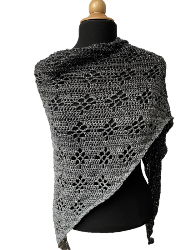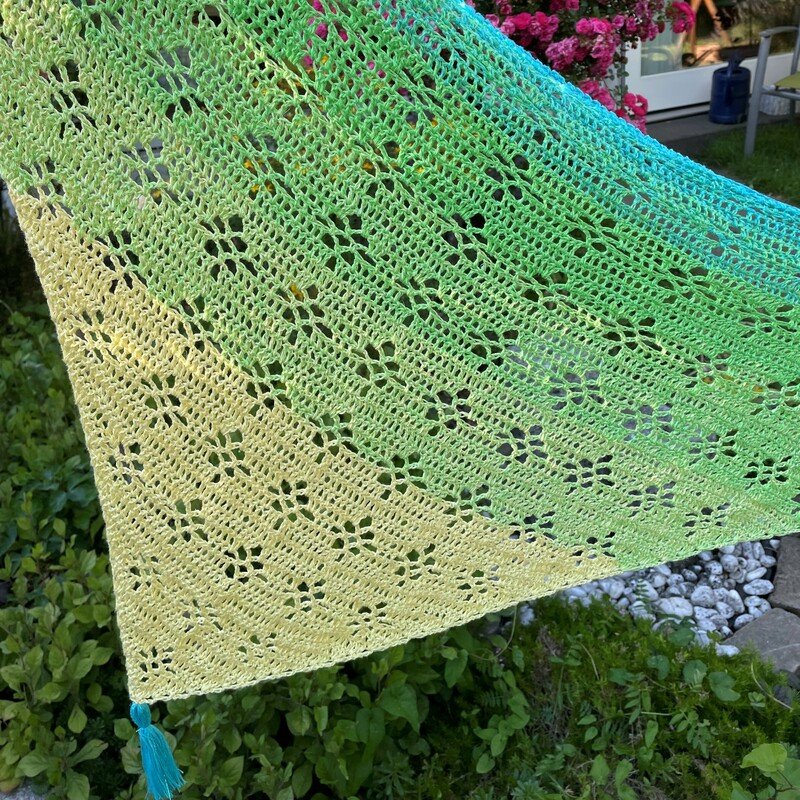 Dieses Dreieckstuch wird von der Spitze aus zur Halskante gehäkelt und besteht aus einem Muster, das an Ornamentblumen erinnert. Das Muster ist schön luftig und passt toll zu Frühling und Sommer.