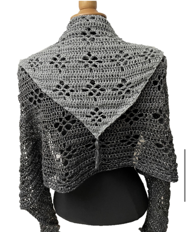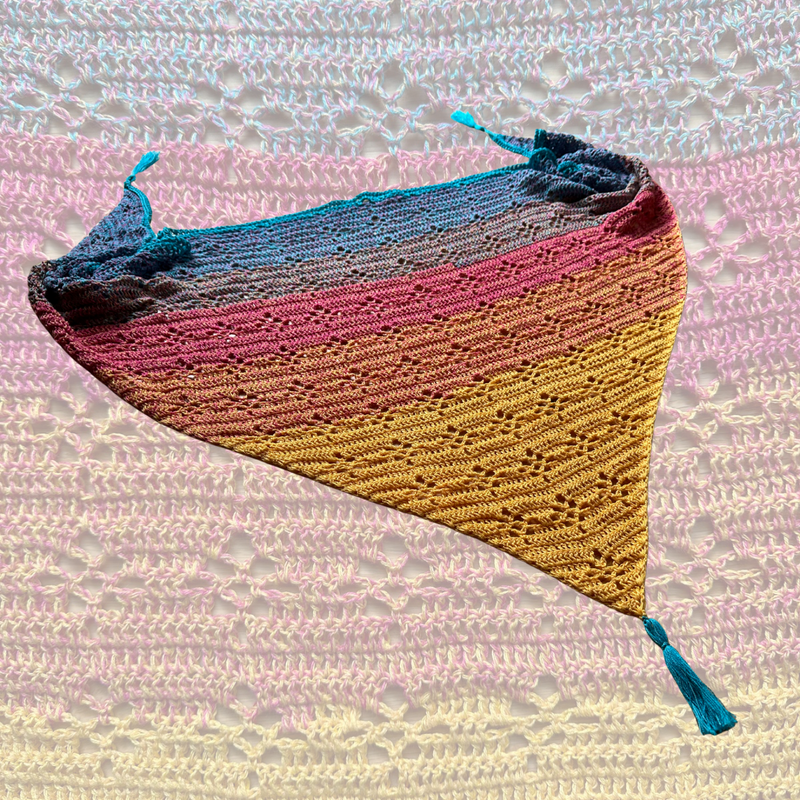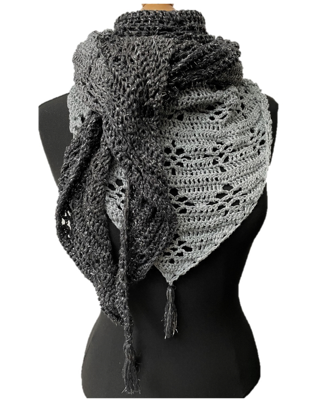 Mein Beispieltuch hat eine Spannweite von 1,80m und eine Tiefe von 0,70m. Gearbeitet wurde es mit einem 3-fädigen Bobbel von 750m LL + Lurexfaden und einer 4er NS.
