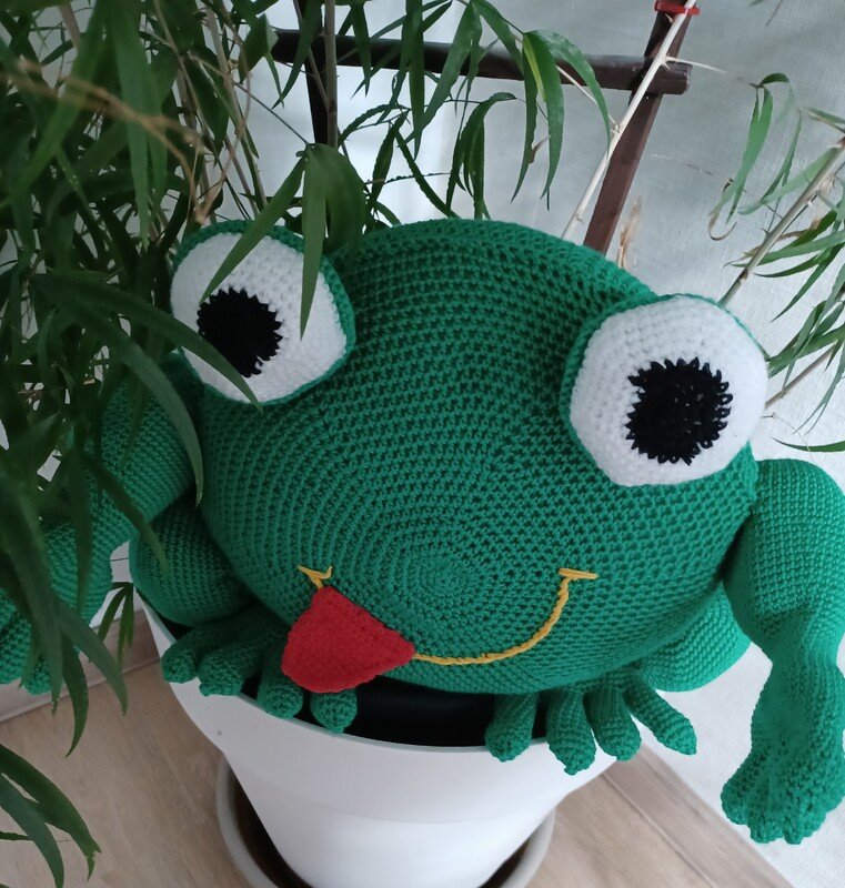 Das Froschkissen, welches du hier nacharbeiten kannst, dient als funktionelles Kissen zur Sitzverkleinerung im Hochstühlchen , zum Kuscheln ,als "Wächter" im Kinderbettchen und zum Entdecken verschiedener Geräusche, dein Kind kann hier mit den Händen am Froschkörper Geräusche machen,welche mittels eingehäkelten Qietscher oder Knisterfolie entstehen. Es wird bestimmt schnell herausfinden, wo du die kleinen Geräuschkulissen versteckt hast.