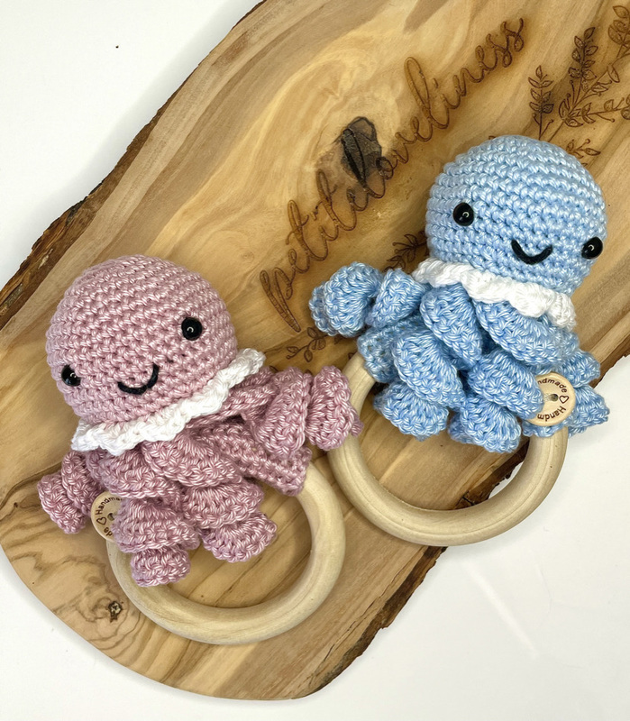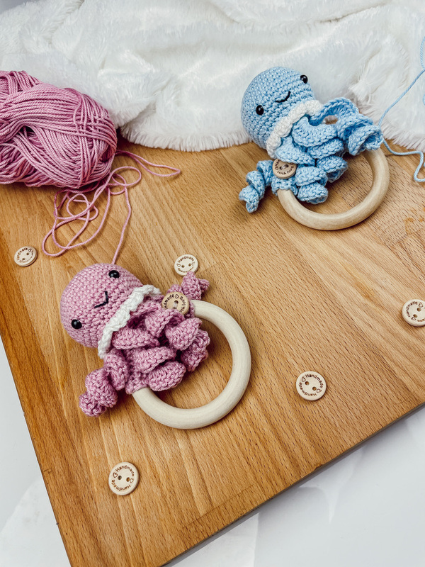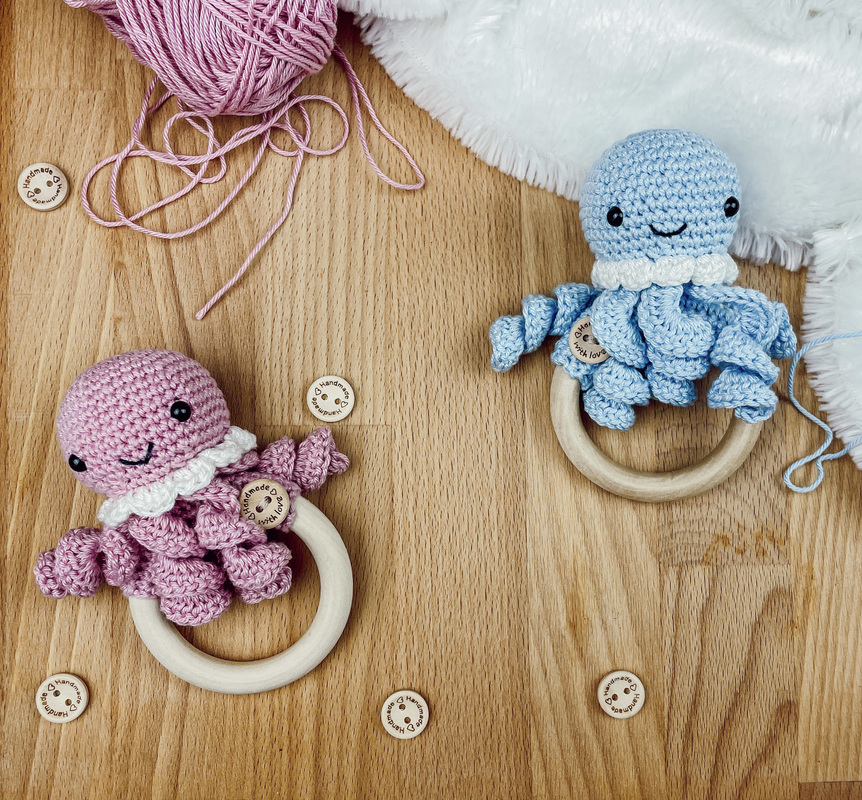 Du erhältst eine Anleitung zur Herstellung meines Beißrings / Greiflings mit der kleinen Krake Marlin, der gleichzeitig eine kleine Rassel ist.