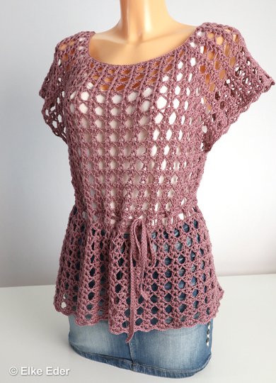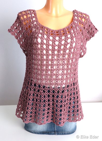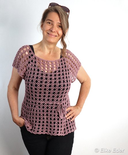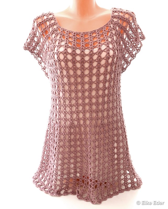Die Häkelanleitung zeigt dir wie du die Tunika in einem Stück von oben nach unten häkelst (Raglan von oben/RVO), deshalb ist sie wunderbar für Farbverläufe/Bobbel geeignet. Du kann das Sommershirt in jeder gewünschten Länge anfertigen - auf den Fotos sind zwei unterschiedliche Längen zu sehen.