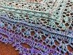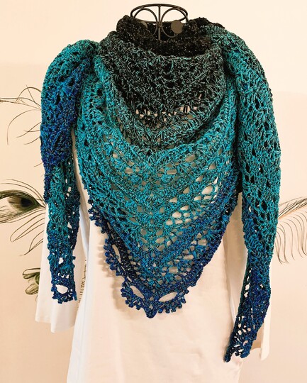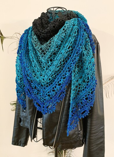 Das zauberhafte Tuch "Melaina" ist ein verspieltes, symmetrisch gehäkeltes Dreieckstuch, das locker und luftig vor allem im Frühling/Herbst getragen werden kann.