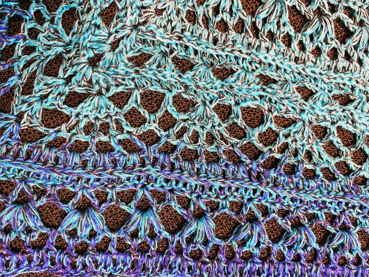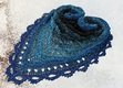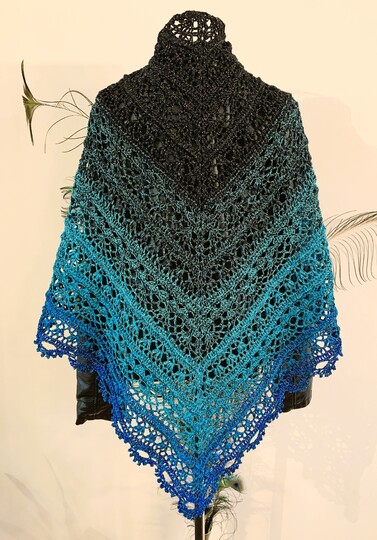 Folgende Wolle wurde verwendet: Lilu's Märchengarne, 4-fädiger Bobbel (43% Polyacryl, 43% Baumwolle, 9% Polyester, 5% Polyamid), 1140 m Länge, 300 g, Farbe: Mystery Blue - der gesamte Bobbel wurde für das Tuch verhäkelt.
