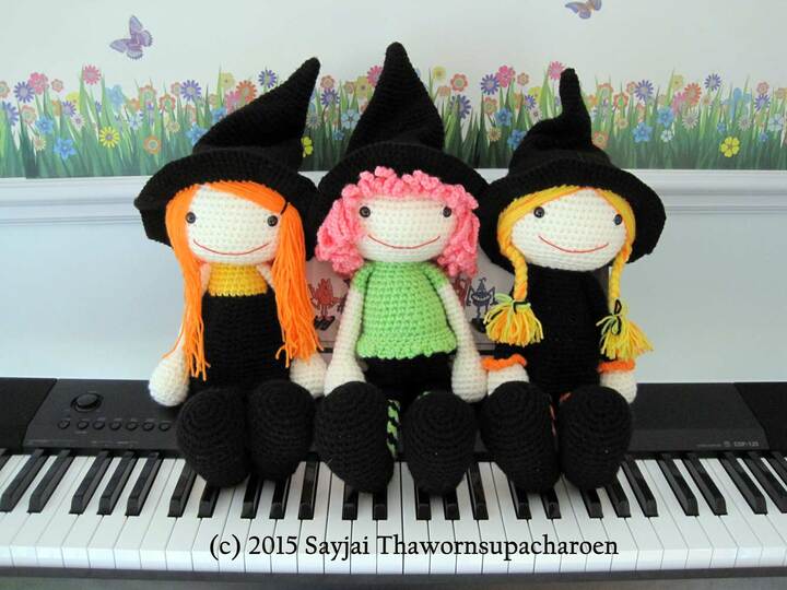 Dies ist eine Amigurumi Häkelanleitung, um drei Hexen zu machen. Hierfür braucht man Grundkenntnisse im Häkeln. Sie sind ganz einfach zu machen: Sie brauchen nur feste Maschen.