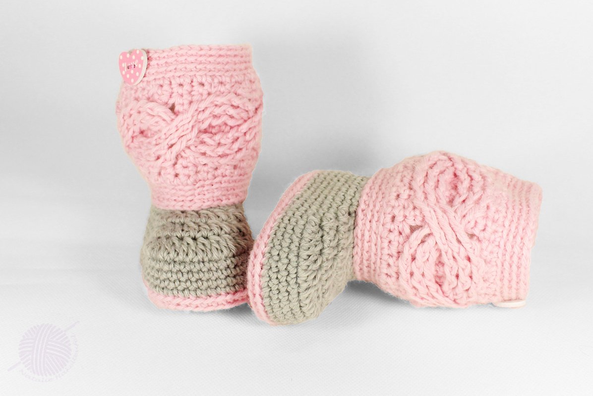 Diese PDF-Häkelanleitung besteht aus bebilderter Anleitung zum Häkeln von Babystiefel mit einem Zopfmuster.
