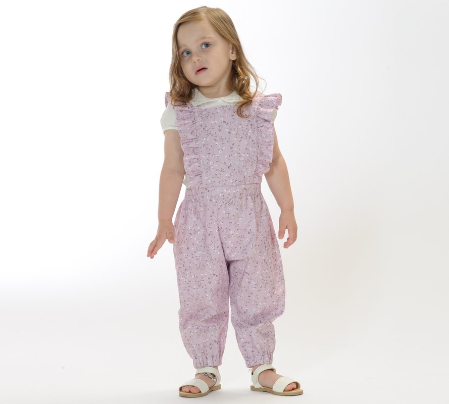 Nähe eine verspielte Mädchen-Latzhose mit dem Schnittmuster DAISY – ein bezauberndes Design mit Rüschen-Trägern, gekreuzten Rückenträgern und Gummizug in Taille & Saum für optimalen Sitz und hohen Tragekomfort.