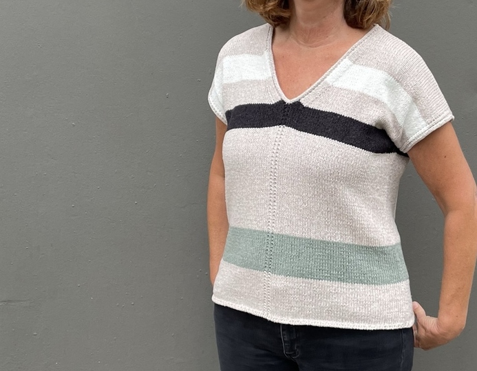 Dieses Strickshirt ist mit dezentem Links- Rechtsmuster und ein paar Streifen versehen. Es ist somit ein perfekter Sommerstricker. Die abgeschrägten Schultern und der V-Ausschnitt verleihen diesem Streifenpulli eine besonders ausdruckvolle Struktur. Die I-Cord Ränder sorgen zusätzlich für einen schönen Rahmen.