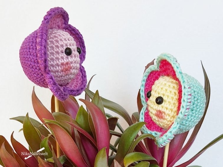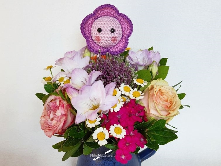Die Blume wird mit Baumwolle 50g/125m gehäkelt. Es wird nicht viel Wolle benötigt (die genauen Angaben stehen in der Anleitung), so dass auch sehr gut Wollreste verbraucht werden können. Es werden 2x 6mm Sicherheitsaugen, eine 2,5er Häkelnadel und etwas Füllmaterial benötigt, sowie ein Schlüsselanhänger oder Schaschlik-Holzspieß nach Belieben.