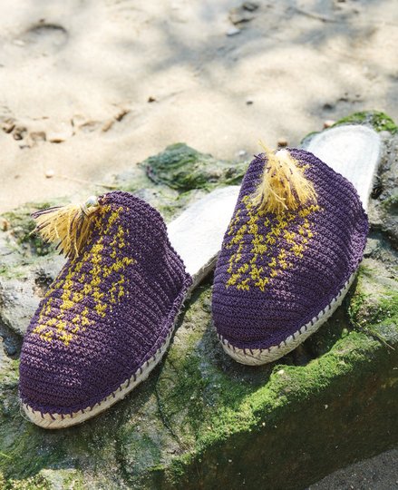 Entspannung pur in diesen gemütlichen Pantoffeln mit Espadrilles-Sohle. Das Jacquardmuster wird hier einfädig mit festen Maschen gehäkelt. Ein kleines Kunstwerk, aber mit ein wenig Geduld nach Zählmuster ganz einfach zu arbeiten.