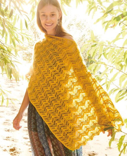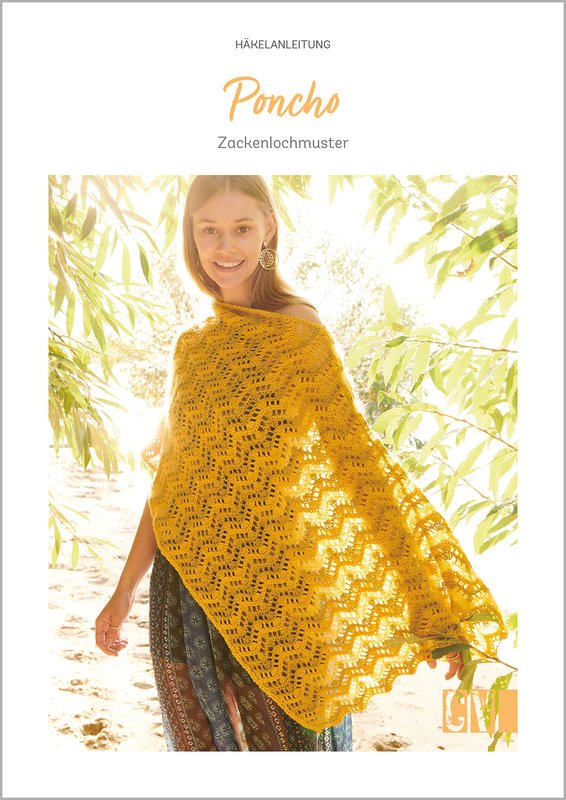 Ein toller Effekt! Das Zackenmuster im Garnmix und in verschiedenen Gelbtönen wird hier neu interpretiert. Obwohl wie ein breiter Schal geradeaus gehäkelt, entsteht durch den Garnwechsel keine Langeweile. Zum Schluss noch an einer Seite zusammennähen und fertig ist der Poncho.