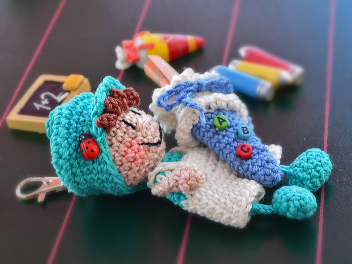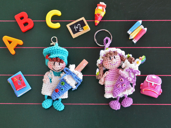 Mit dieser Anleitung zeige ich dir, wie du diesen lustigen Anhänger "Schulanfang Junge in Latzhose mit Schultüte " häkeln kannst.